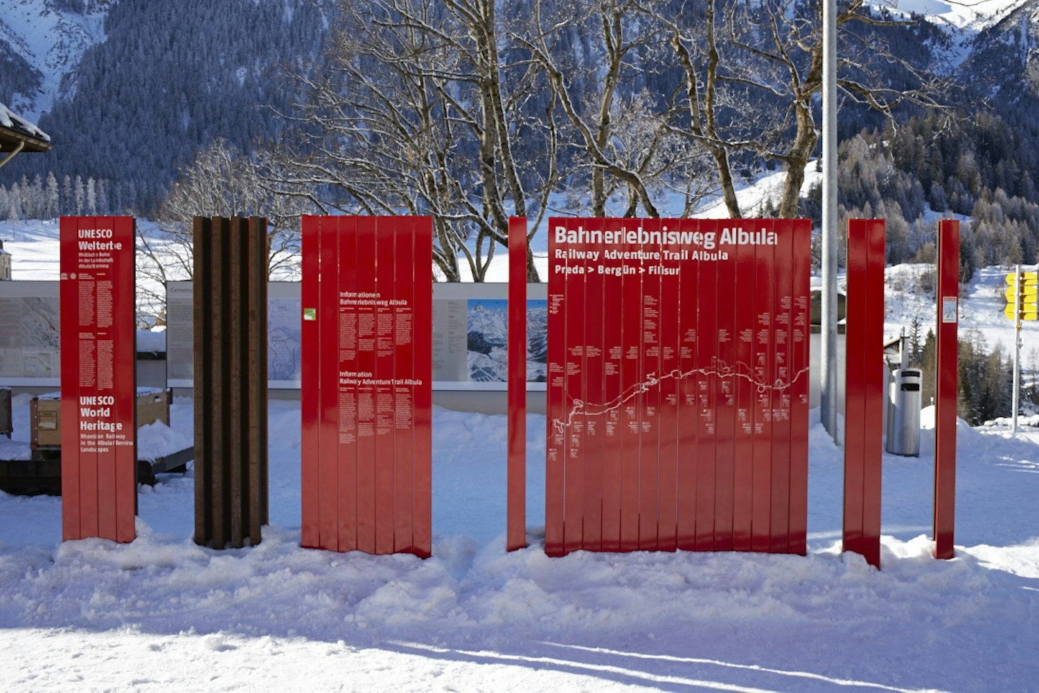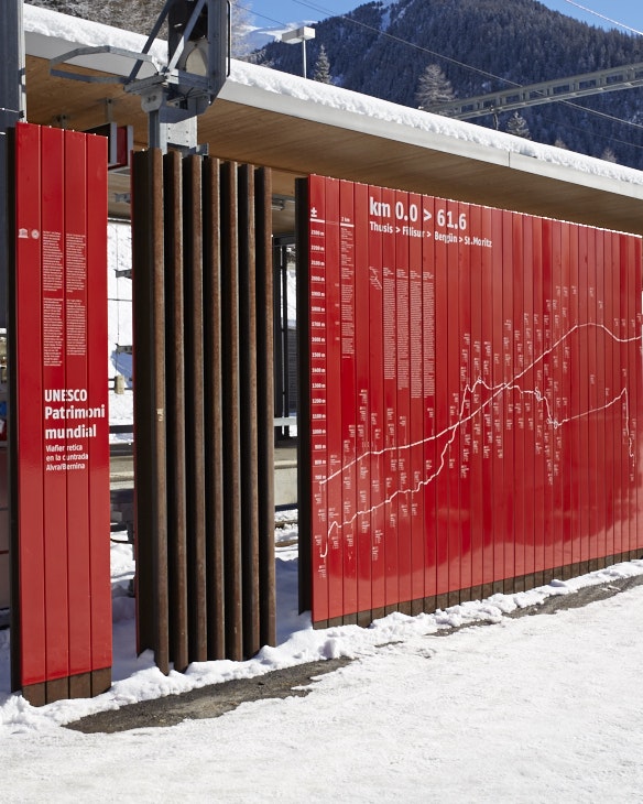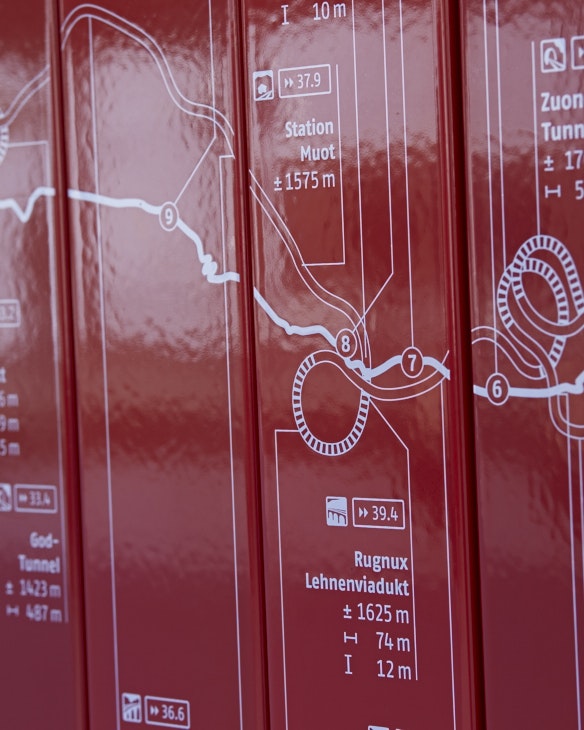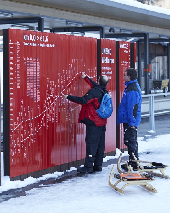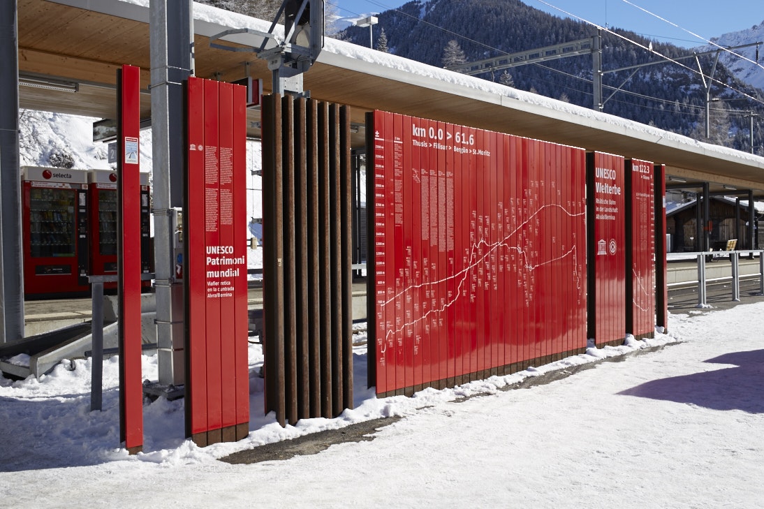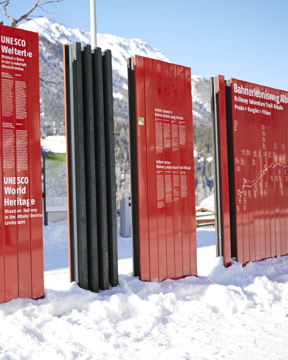 Seit 2008 gehört die Rhätische Bahn in der Kulturlandschaft Albula/Bernina zum UNESCO Welterbe. Entlang der Strecke wurden an verschiedenen Haltestellen mehrteilige Infowände und Stelen montiert, welche aus emaillierten Clips bestehen. Mit höchster Präzision mussten die einzelnen Elemente im Siebdruck gedruckt und eingebrannt werden, damit sich die Clips nahtlos zum gewünschten Bild zusammenfügen.