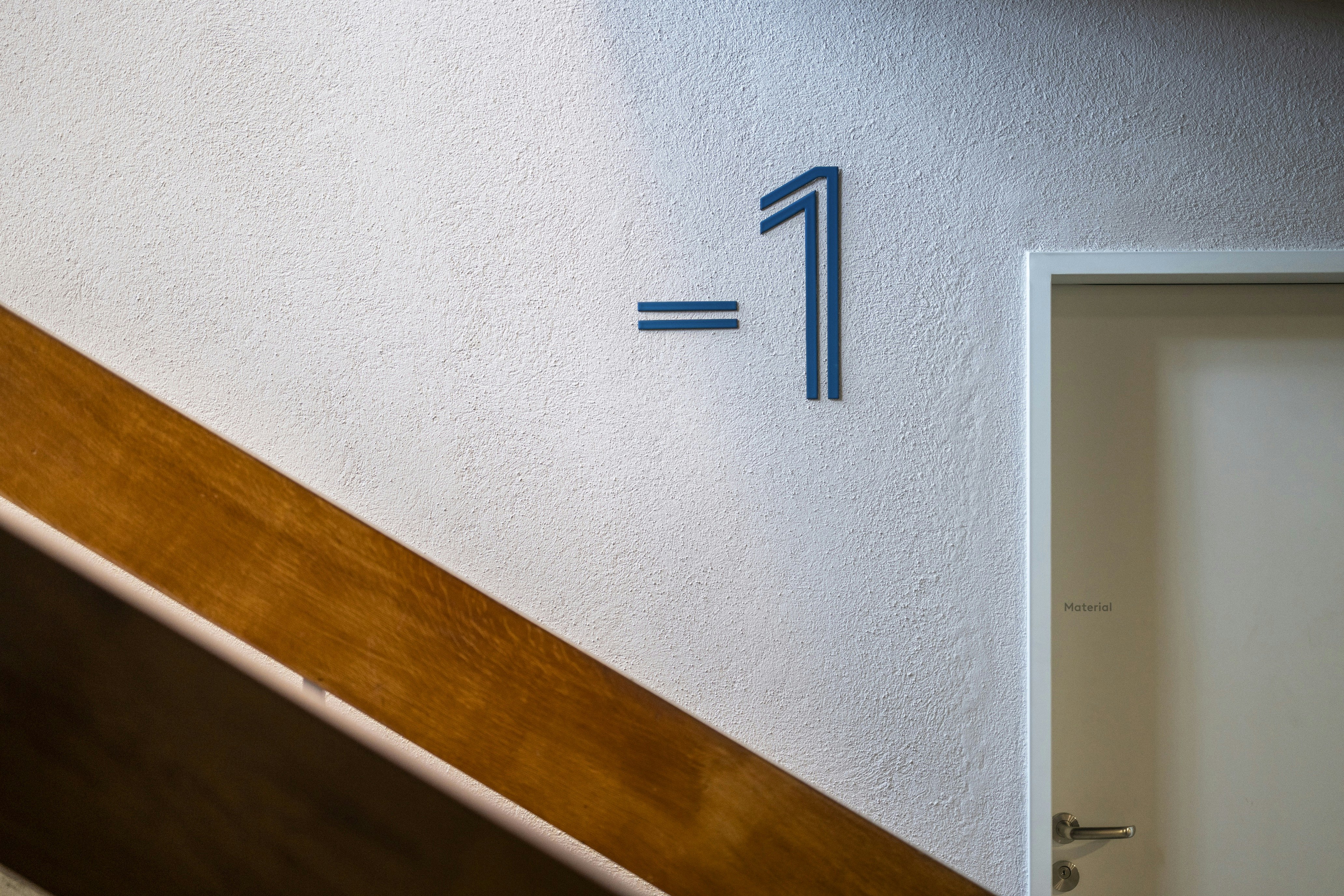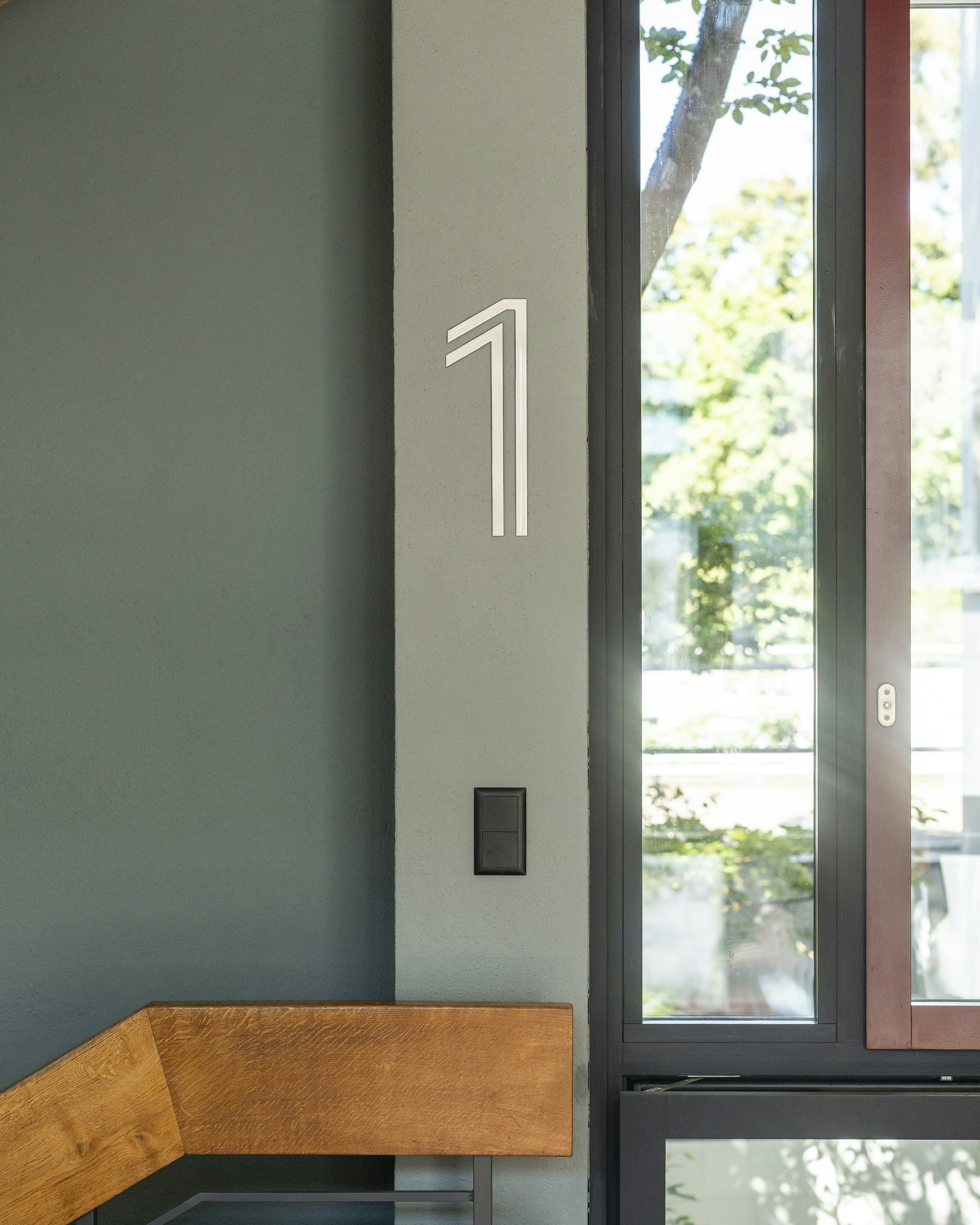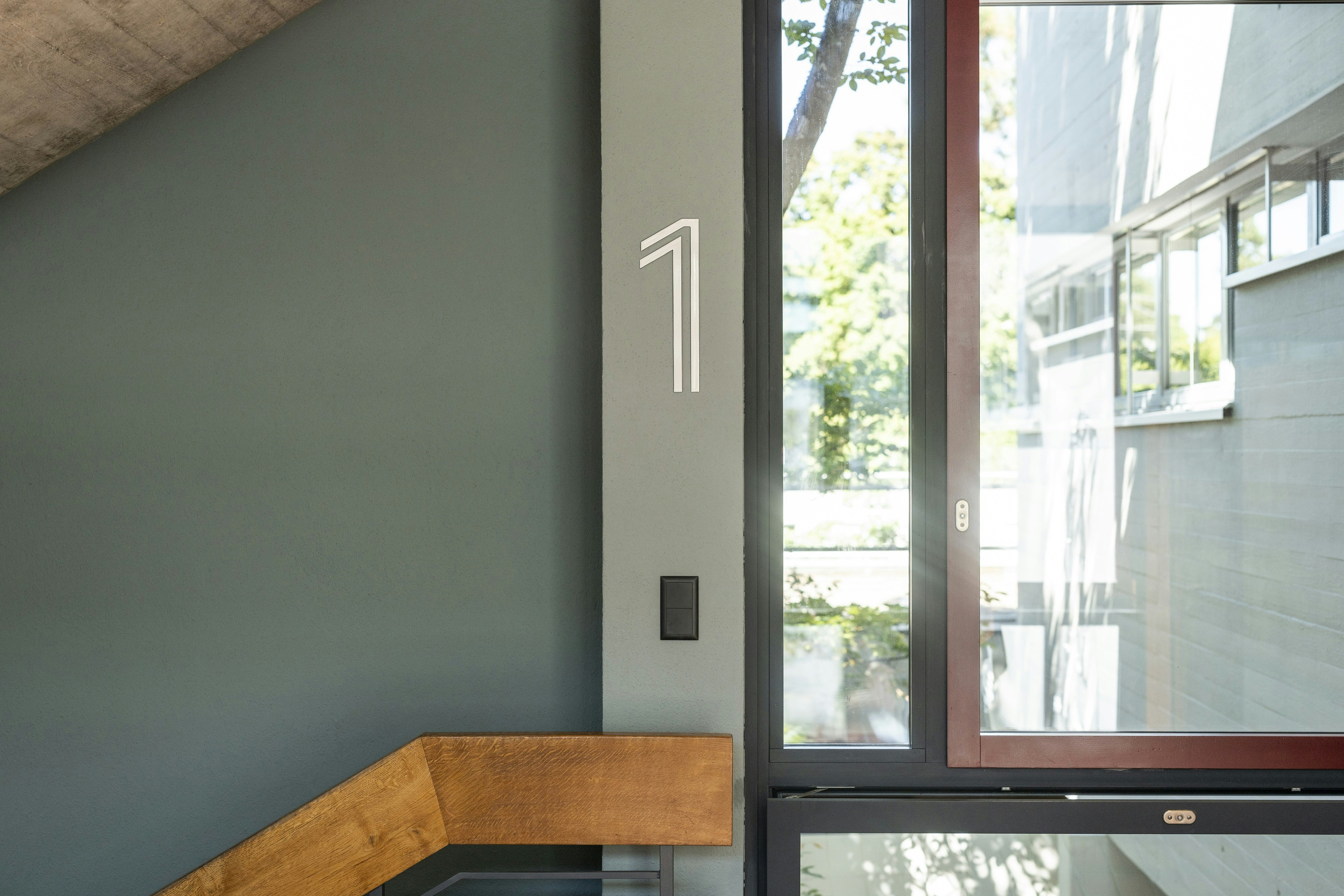 Emaillierte Piktogramme stellen eine sprachunabhängige und altersgerechte Orientierungshilfe für die verschiedenen Nutzungen dar. Emaillierte Schilder und Ziffern ergänzen die Piktogramme für die allgemeine Gebäudeorientierung auf den Stockwerken.
