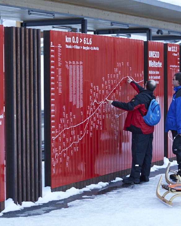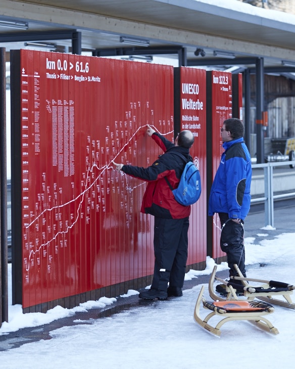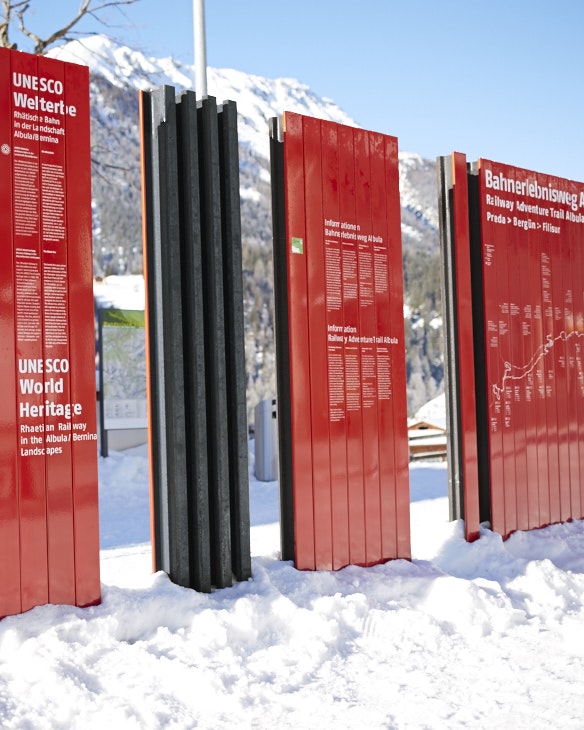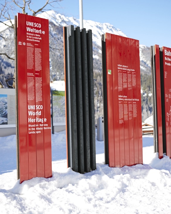 Depuis 2008, les Chemins de fer rhétiques font partie du patrimoine mondial de l'UNESCO dans le paysage culturel de l'Albula/Bernina. Le long de la ligne, des panneaux d'information et des stèles en plusieurs parties, constitués de clips émaillés, ont été montés à différents arrêts. Avec une extrême précision, les différents éléments ont dû être imprimés en sérigraphie et cuits au four afin que les clips s'adaptent parfaitement les uns aux autres à la fin et forment l'image souhaitée.
